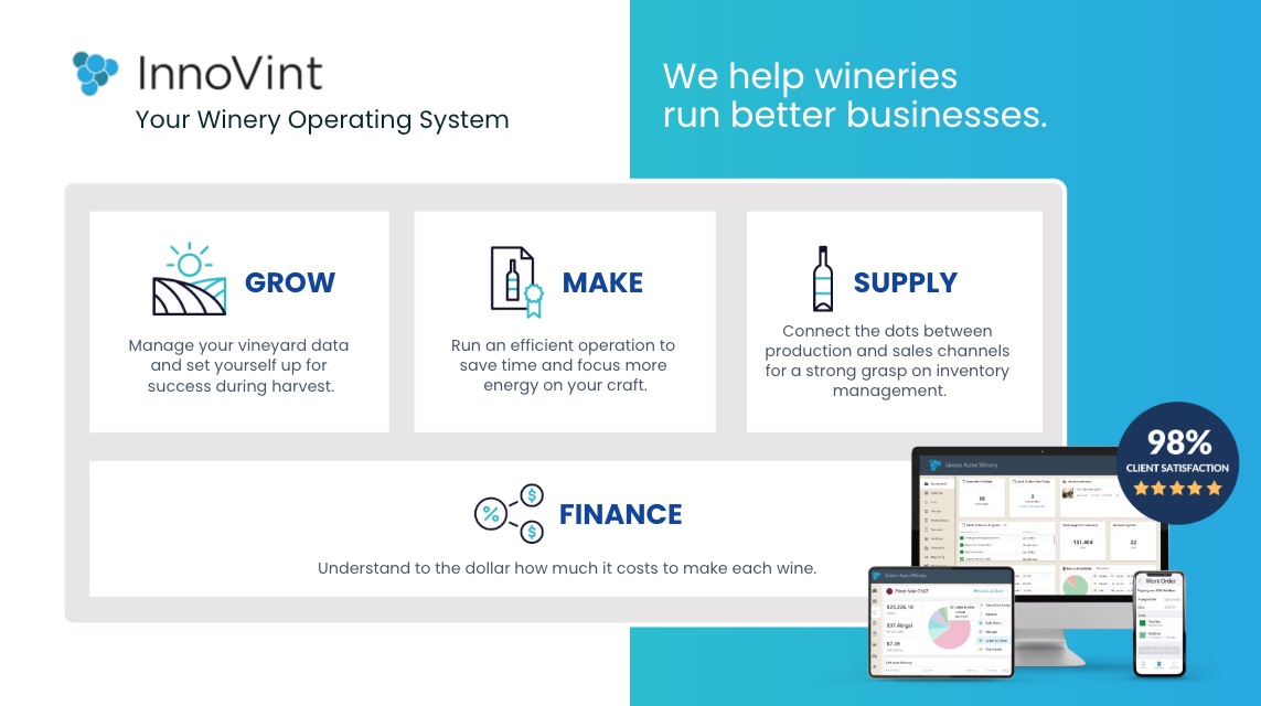 It joins other InnoVint products, including GROW (vineyard), MAKE (production), and FINANCE (costing), to complete InnoVint’s all-in-one winery operations platform.