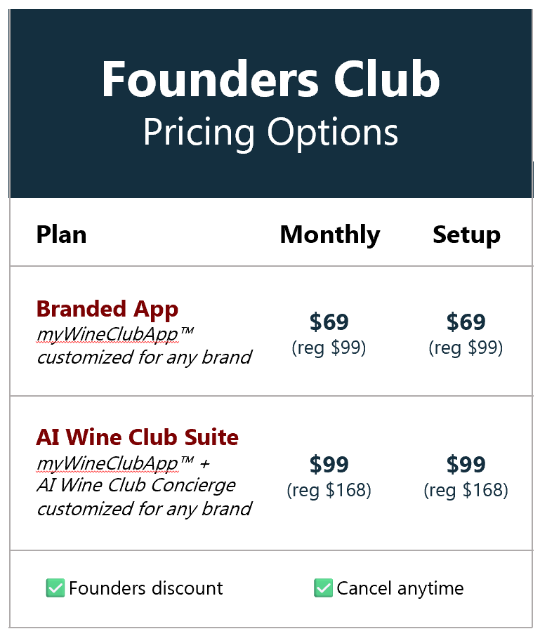 Join our Founders Club to experience a better way to engage club members. Be one of the first to delight your best customers and profit from your own wine club app while your competitors are still on the sidelines.