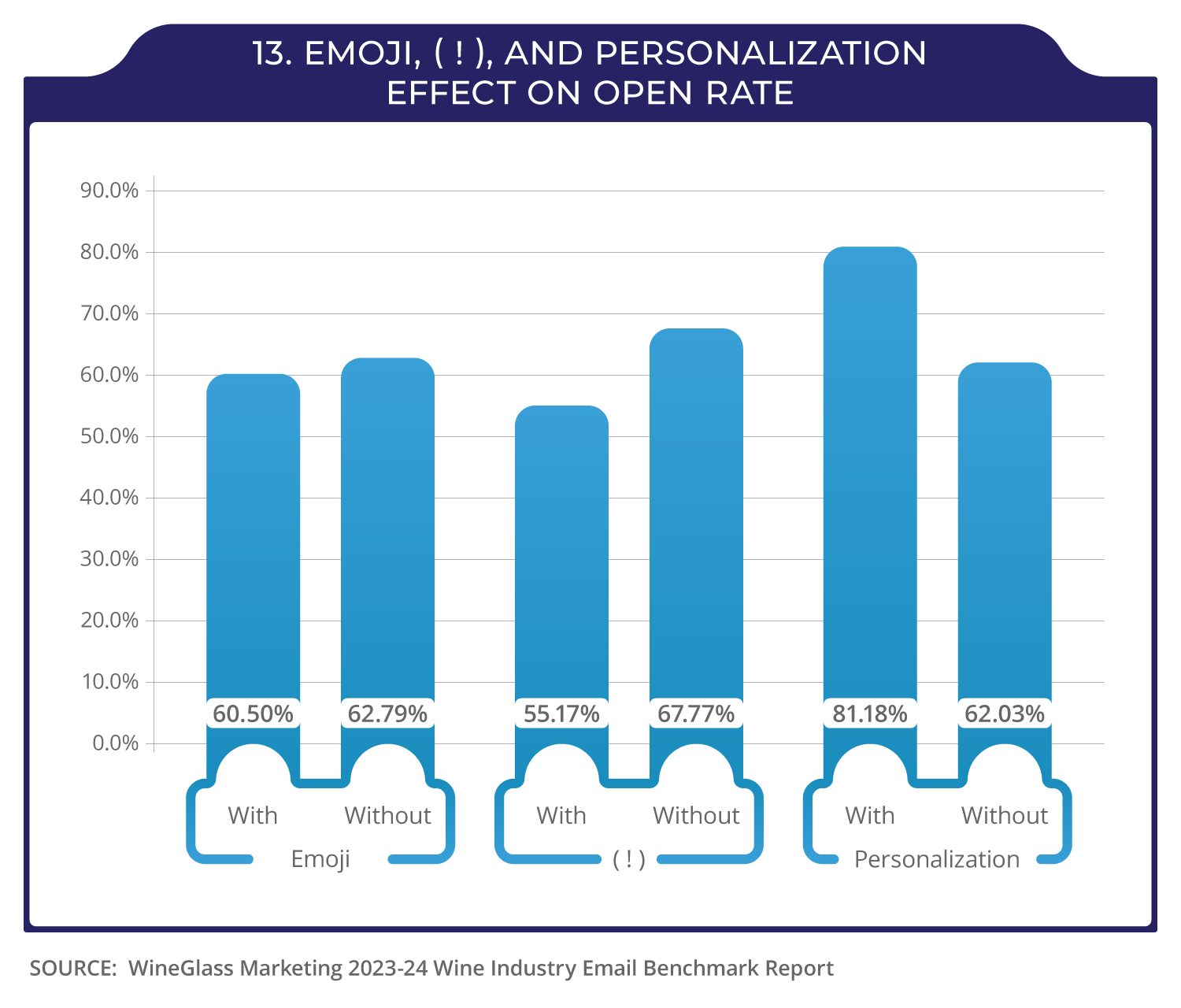 Each is specific, grounded, and human. According to GetResponse’s 2024 benchmark report, subject lines with time-based or personalized language lift open rates by 22%. Our own benchmarks shows that yelling, in fact, doesn’t work. Subject lines without an exclamation mark (!) saw 23% greeter open rates that subject lines with one.