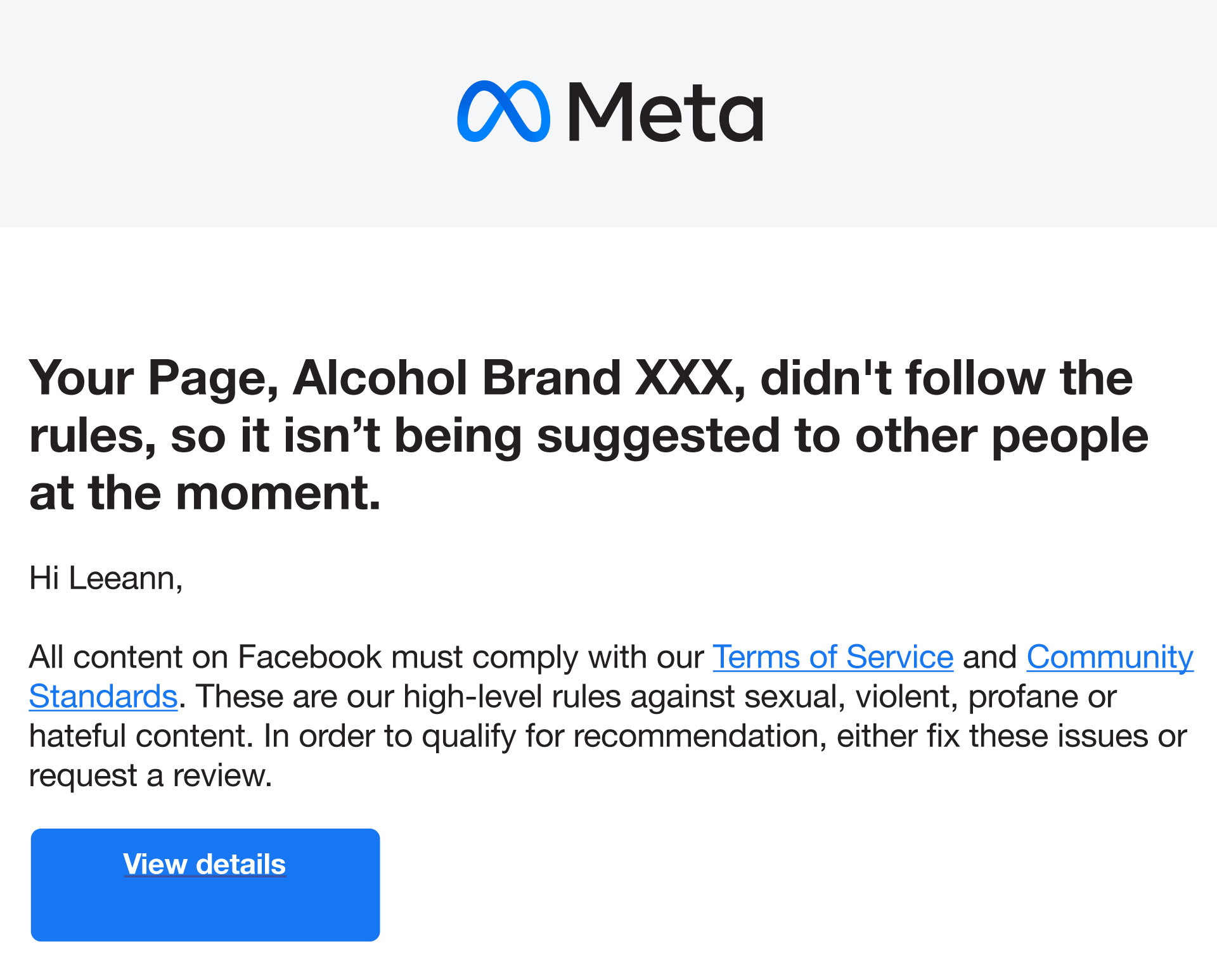 Most wineries encountering this issue are fully compliant with Facebook’s Community Standards. Their content is allowed to exist on the platform. What has changed is recommendation and amplification, which Facebook controls separately under its Terms of Service.