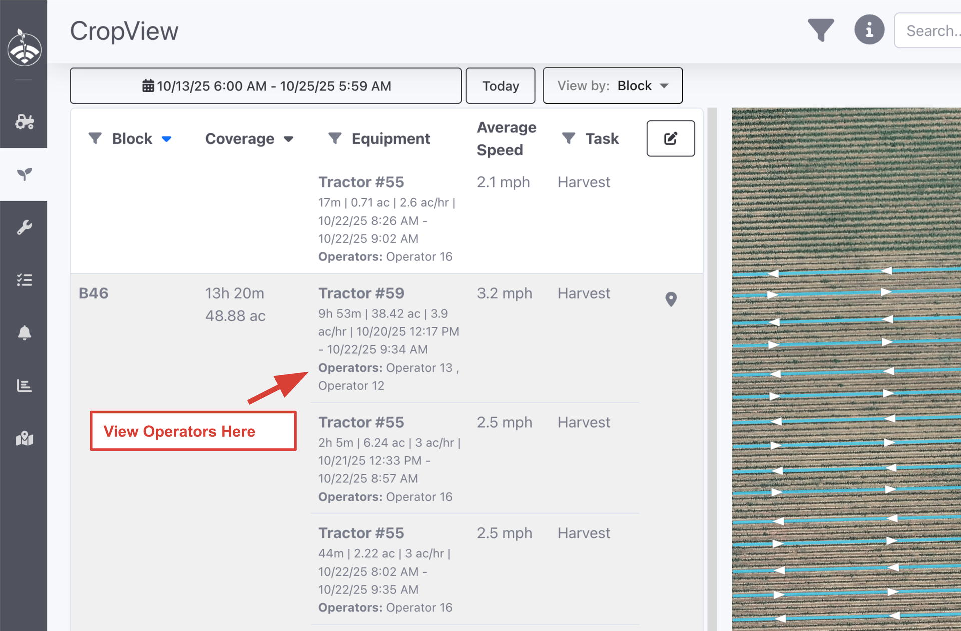 CropView now displays operator assignments for each machine. Reviewing field coverage? You'll see who was behind the wheel at a glance.