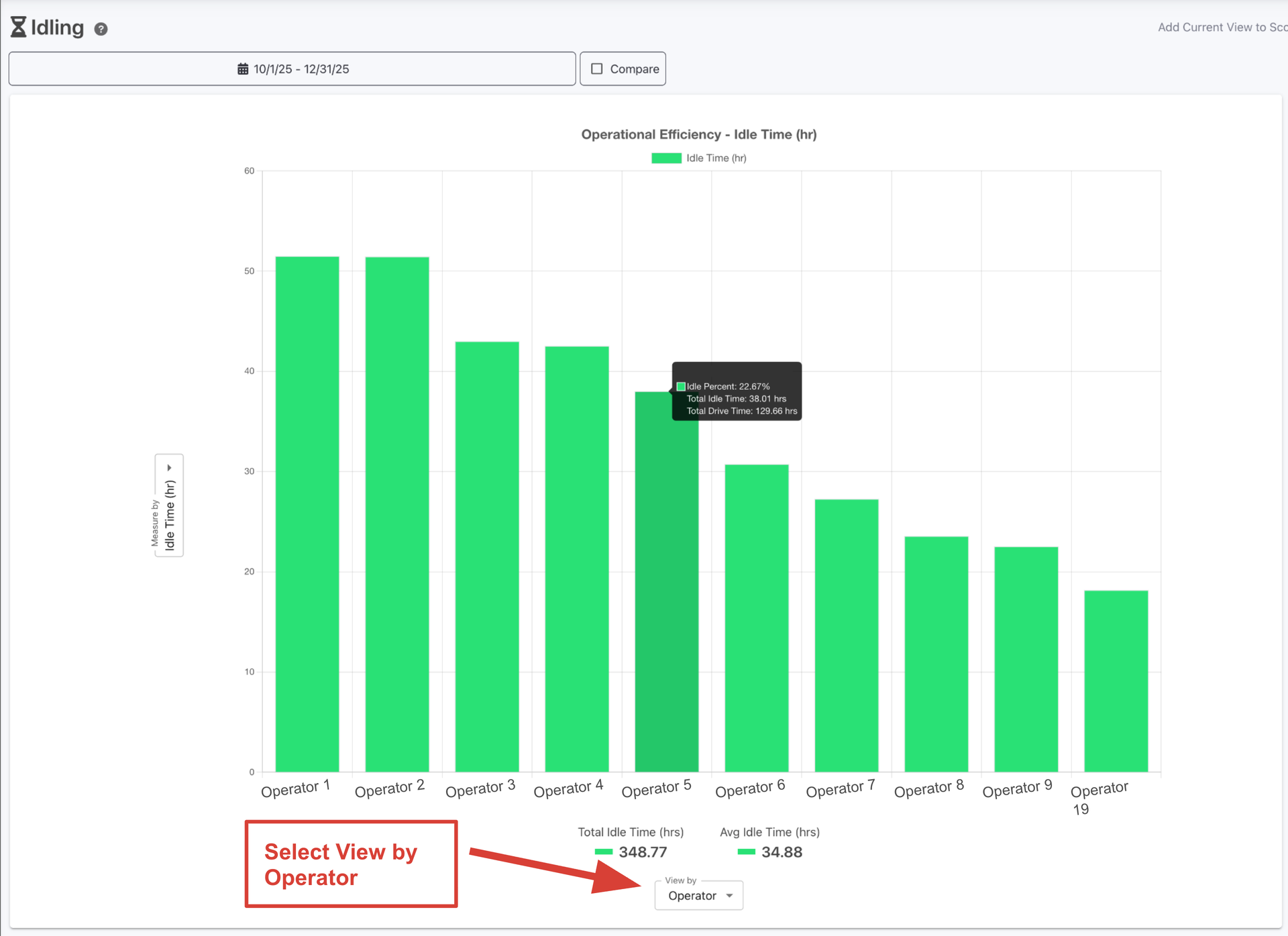 View reports by operator - see exactly who's racking up the most idle time, or compare efficiency across your team (i.e. mph, ac/hr). Just select "Operator" in the View By dropdown on reports like Idling or Farming Efficiency.