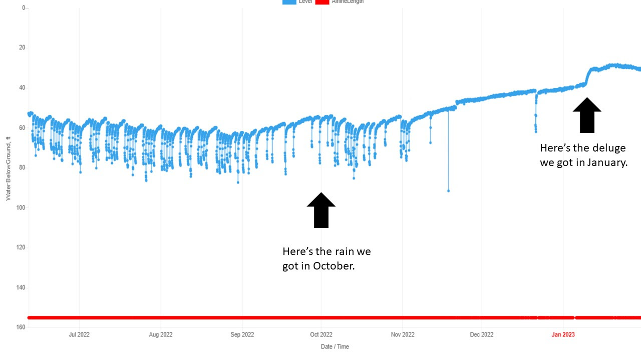 This is a shallower well. As you can see the water level varies with rainfall starting with the rain we got in October. The January rain caused a big jump in static water level, raising it by almost 35 ft.