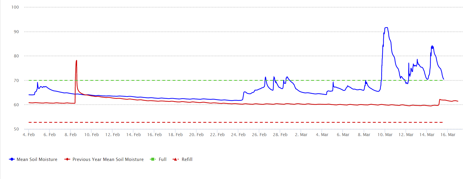 Look at that. The blue line above is this year's average water content while the red line is last year's. This block is in a much moister position than it was last year.