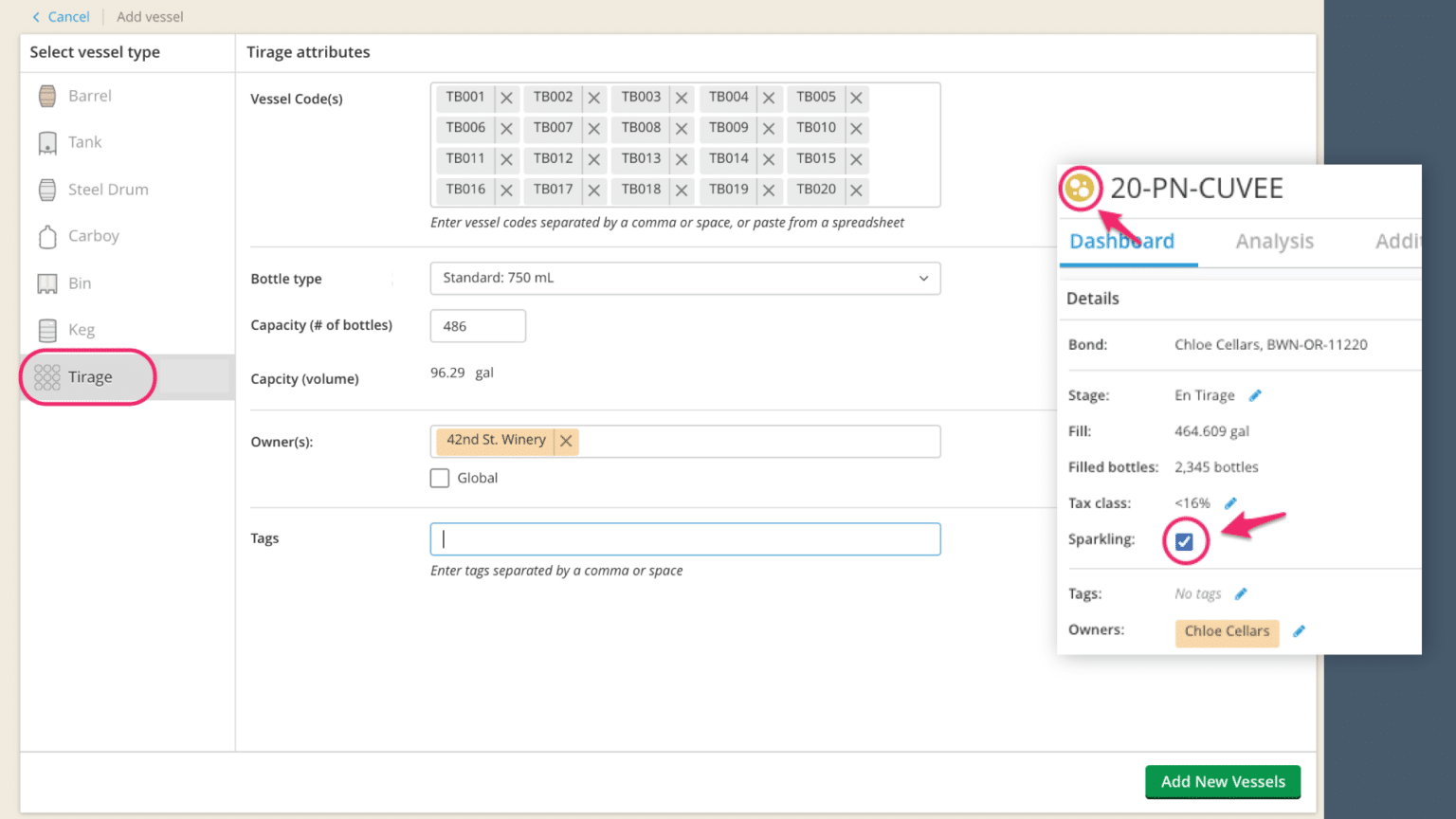 This module supports Methode Champenoise with specific workflows through tirage, riddling in tirage bins, disgorgement, and dosage. The feedback from this latest feature has been excellent! Get all the Sparkling Module details here.