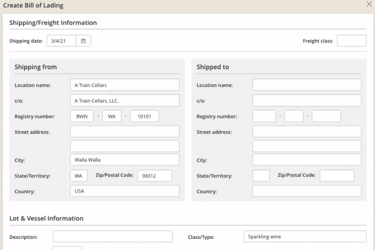 Produce and print a bill of lading, auto-filled with information from InnoVint, to transfer inventory out of bond. Learn more about BOL here.