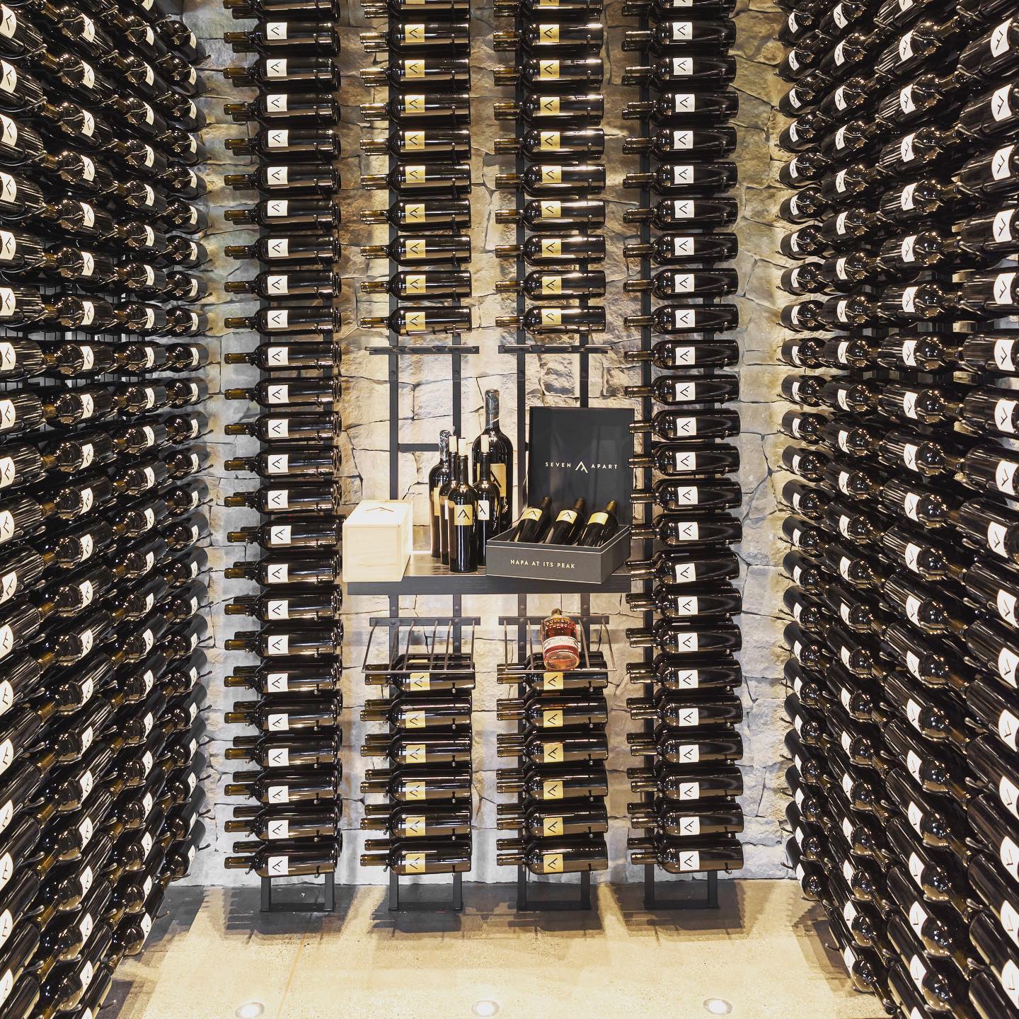 The private tasting room provides intimate an tasting experience, overlooking the production building, with a custom wall-to-wall operable window system. The room also features a stone wall with a floor-to-ceiling window that allows for a glimpse into the custom wine display room with a floor-to-ceiling wine rack system that showcases the winery’s recent vintages.