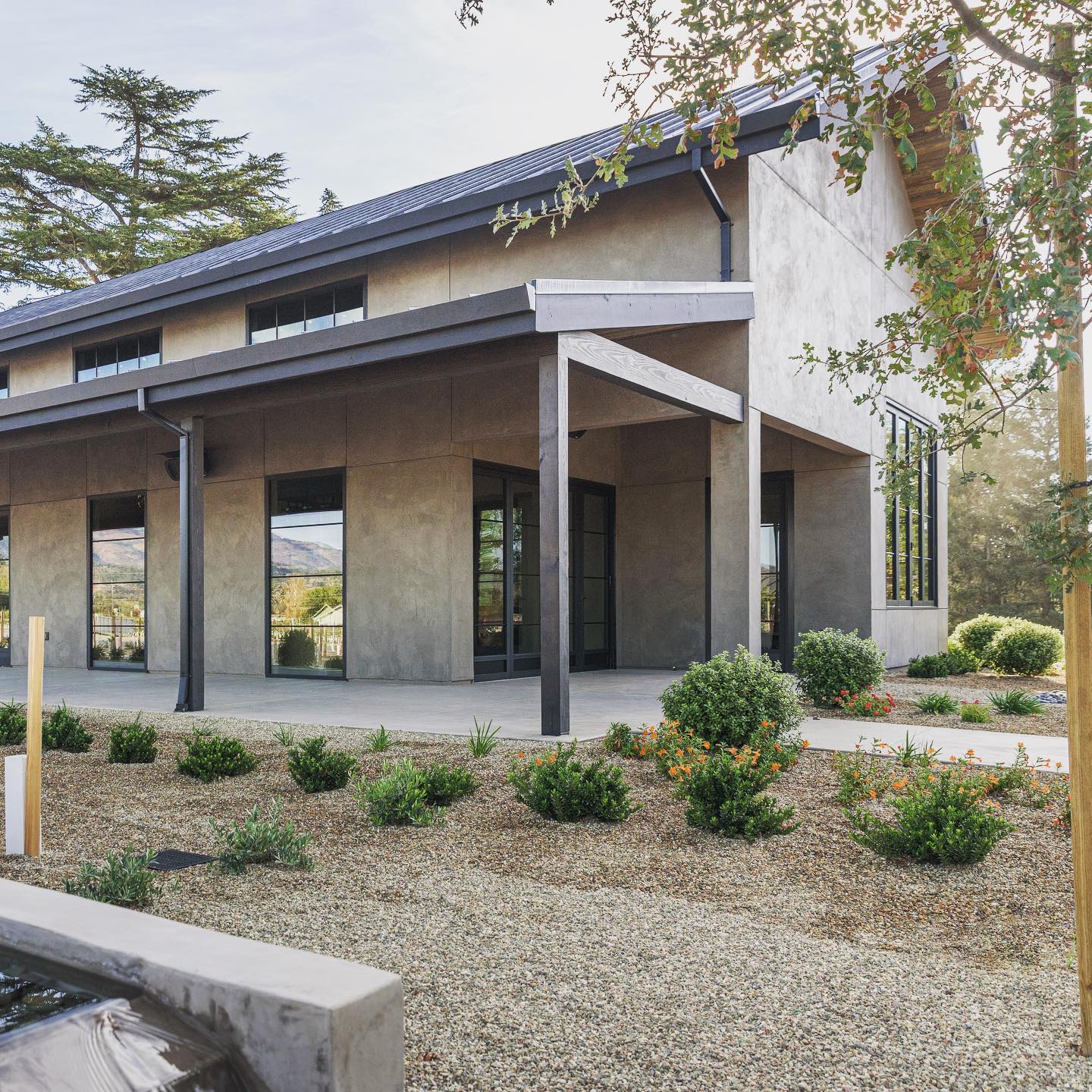 The new office space and service kitchen provide the wine-making team with a large working area away from the production space and a location to prepare for events and wine tastings without impacting the guest experience. Exterior spaces include 4 separate private tasting experiences and three custom fountains located around the building, providing guests with a unique outdoor experience.