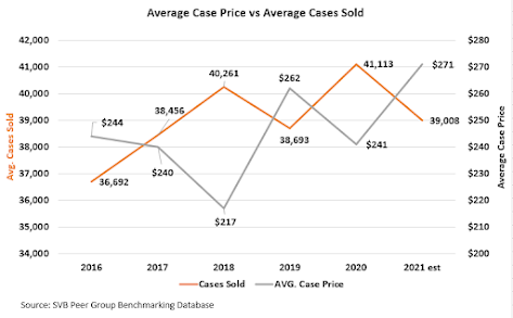 During the pandemic, nothing looked normal for premium wineries. In 2020, the average cases sold in our database of premium wineries increased 6.3 percent, from 38,700 cases to 41,100 cases, while the average price per case dropped 8 percent, from $262 per case to $241 per case. That once again reversed course in 2021 with higher sales dollars on lower volume.