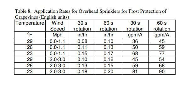 Below is a table that outlines when to turn on your sprinklers taking dew point into account. Pick a Wet bulb temperature that corresponds to the critical temperature at which you want protection for your vines, say 32° (or lower if you’re protecting against winter kill). Then select your dew point. Where those two fields meet is the temperature at which you want to start your sprinklers.
