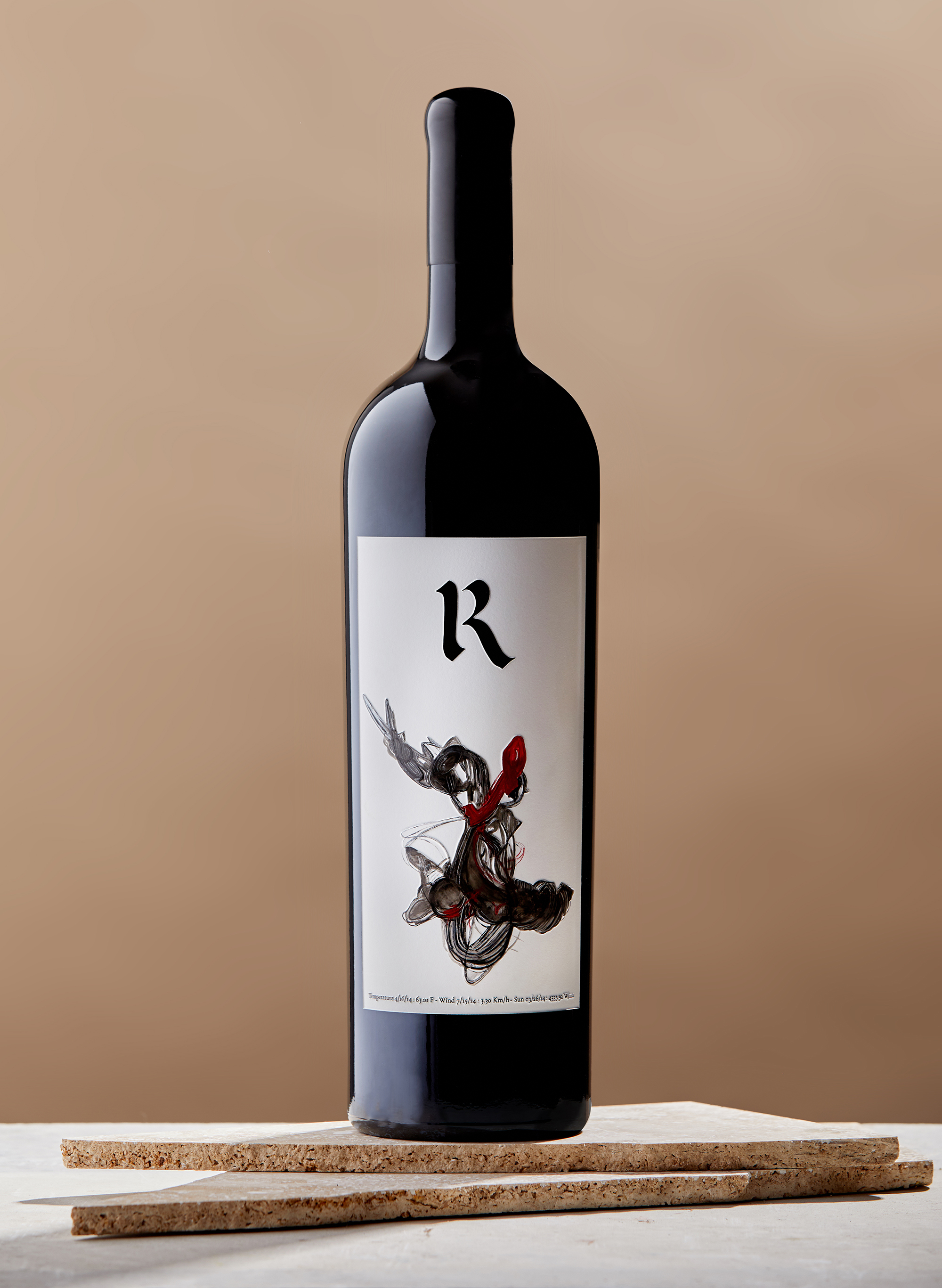 To create this label, Sergio developed an algorithm using data Benoit provided from weather stations on the Estate, including temperature, wind, and solar radiation throughout the 2014 growing season (the first vintage of Moonracer). He then inserted the data into the algorithm, and the computer was able to “read” the information and produce abstract images.