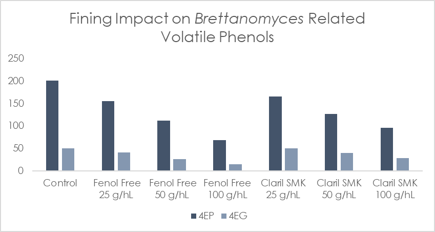 More recently, Claril SMK has been applied to remediate wines with volatile phenols arising from Brettanomyces contamination with excellent results. We compared Claril SMK to Fenol Free, a separate but very effective deodorizing carbon for remediating Brettanomyces taint in wine. While not quite as effective at removal of volatile phenols as the Fenol Free, we did observe significant reduction in volatile phenols, with excellent retention of color and phenolics.