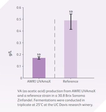 AWRI UVAmaX has the natural capability to reduce the level of volatile acidity in wine. The resultant wine made with this yeast makes it more pleasant due to the decrease in acetic acid (vinegar) and ethyl acetate (nail polish) aromas.