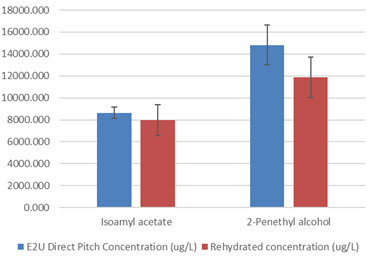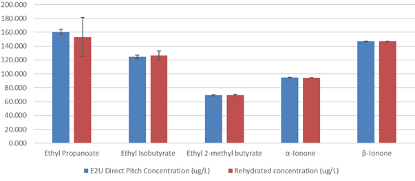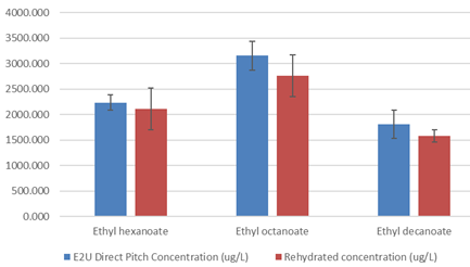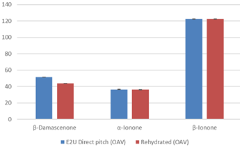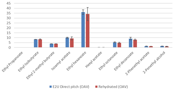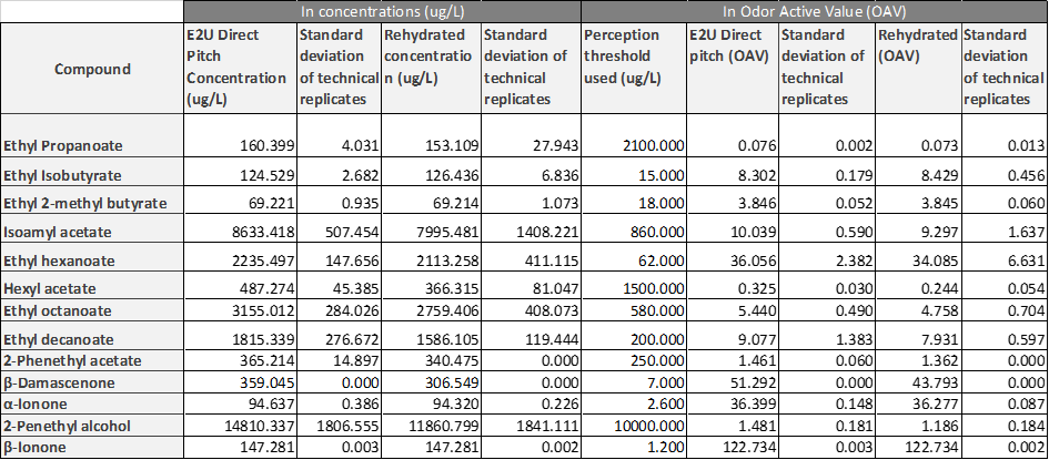 The below table and graphs presents the data in concentration and Odor Active Value for the 13 compounds analyzed along with the standard deviation for the analyis ran in triplicate. The analysis shows that there is a trend of the E2U direct pitch scenario produced more aromatic compounds but it is not significant when taking in consideration the standard deviation for most compounds. Out of the 13 molecules analyzed only the 2 phenyl ethyl acetate and the β-Damascenone are significantly different, positivively toward the E2U direct pitch wine. When we take into consideration the threshold perception, the 2 phenyl ethyl acetate is just at the threshold of perception and probably does not affect the aromatic profile very much. The β-Damascenone is the only molecule that is significantly higher for the E2U direct pitch scenario and clearly above threshold of perception that could affect the wine aromatic perception as aroma enhancer.